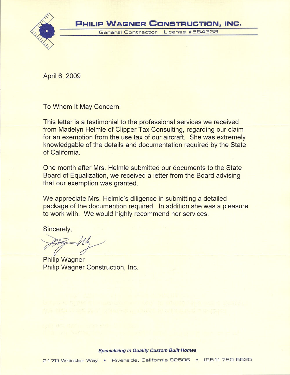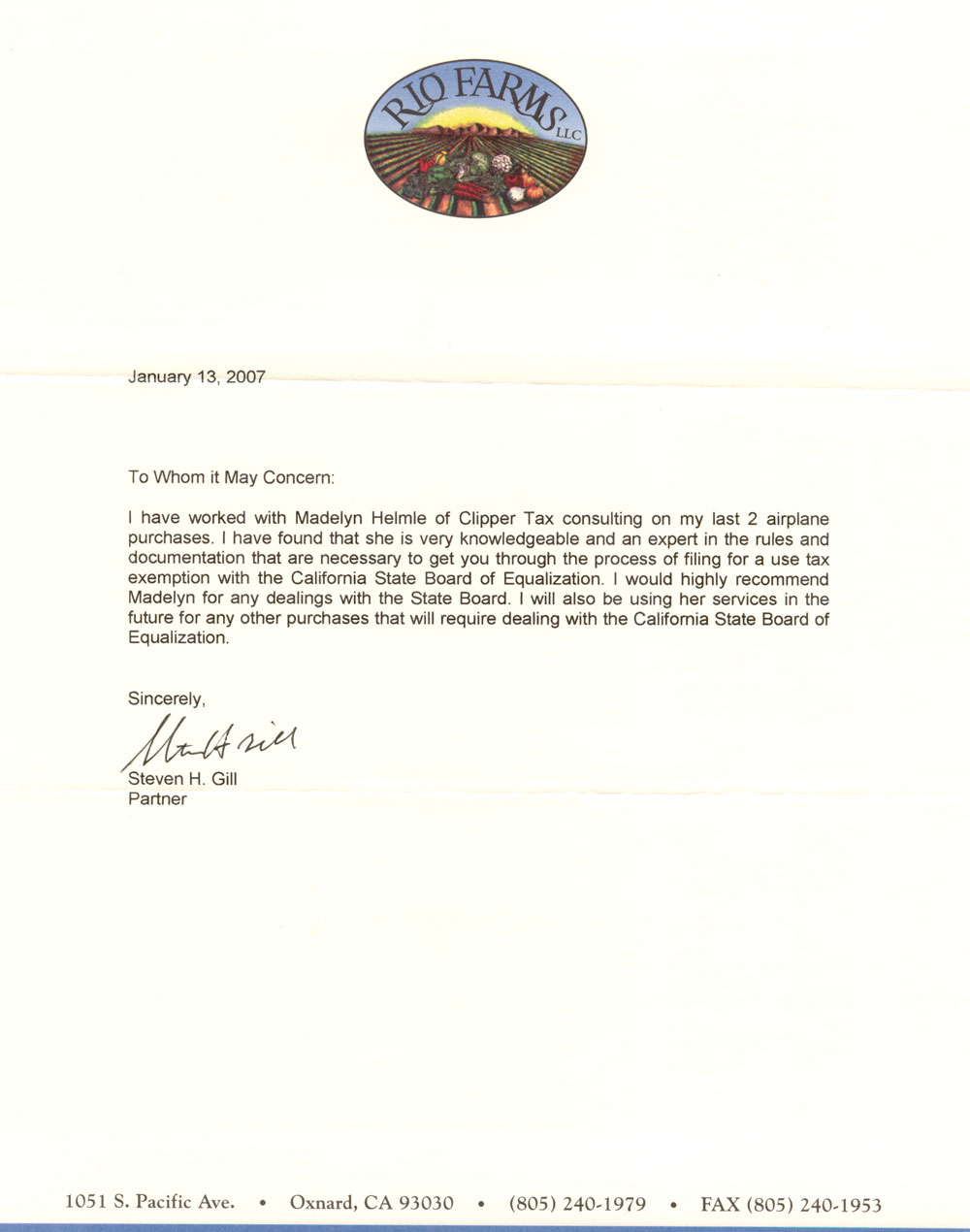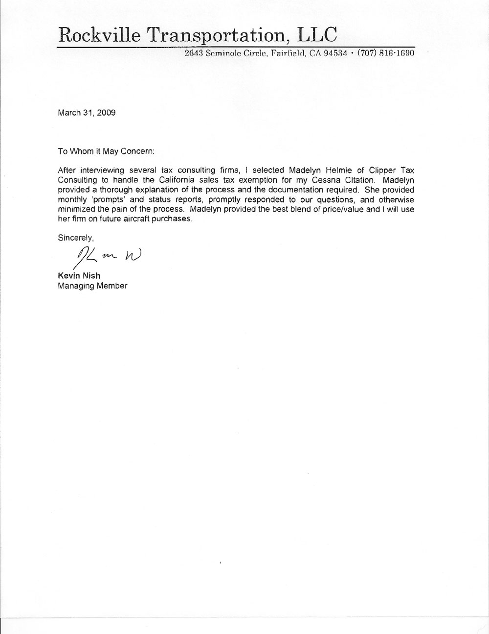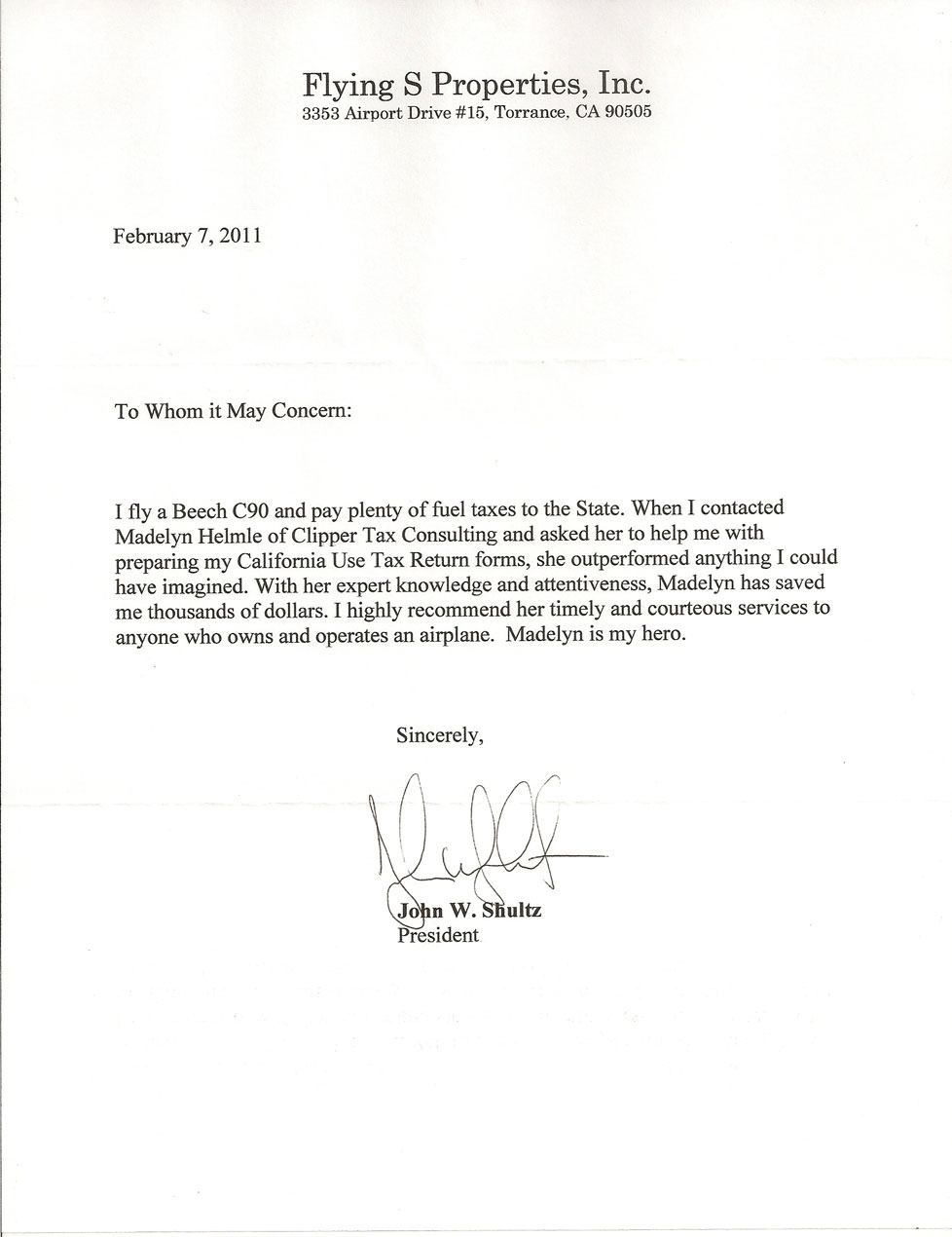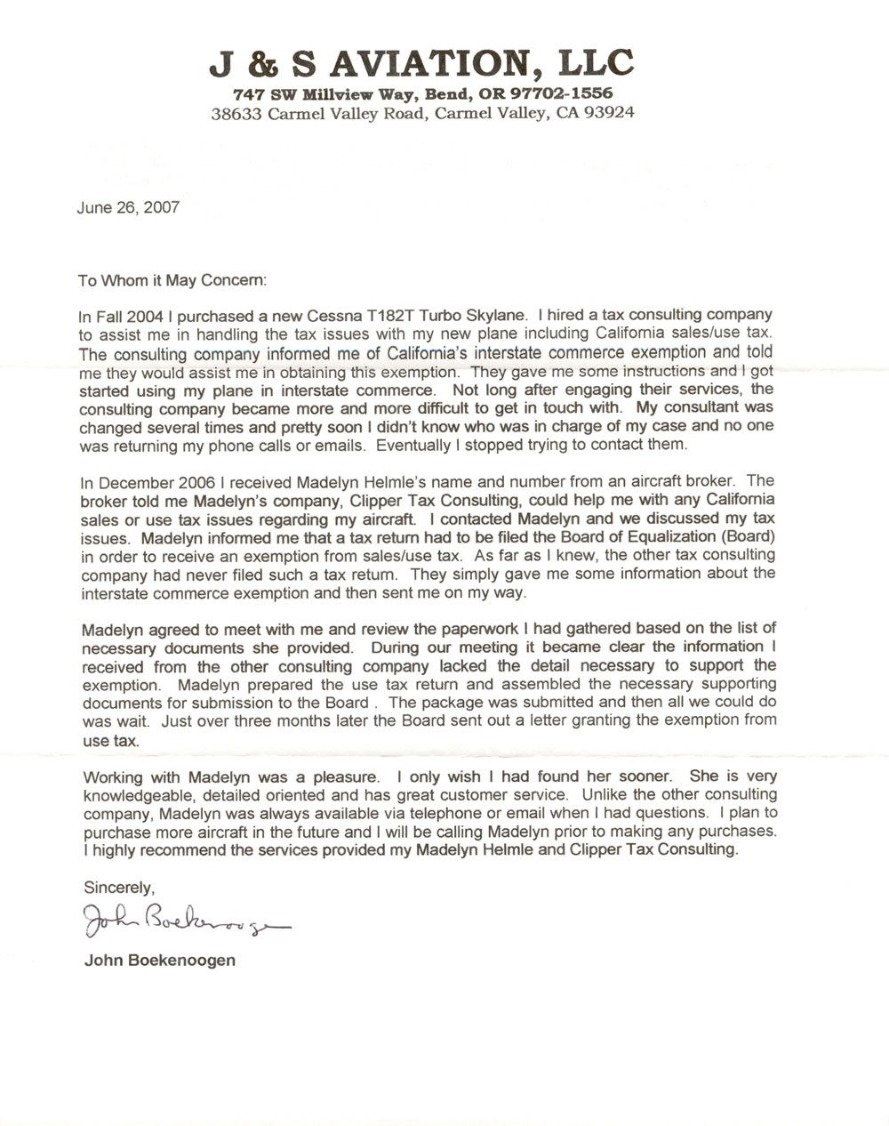 "I have worked with Madelyn Helmle of Clipper Tax Consulting on my last 2 airplane purchases. I have found that she is very knowledgeable and an expert in the rules and documentation that are necessary to get you through the process of filing for a use tax exemption with the California Department of Tax and Fee Administration."