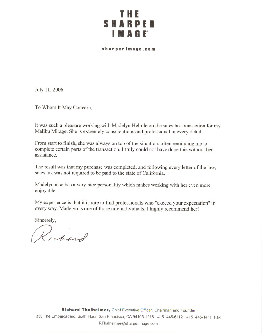 "I feel very fortunate to have employed Madelyn Helmle and Clipper Tax Consulting for the handling of the California sales/use tax exemption on the purchase of my new Cirrus.