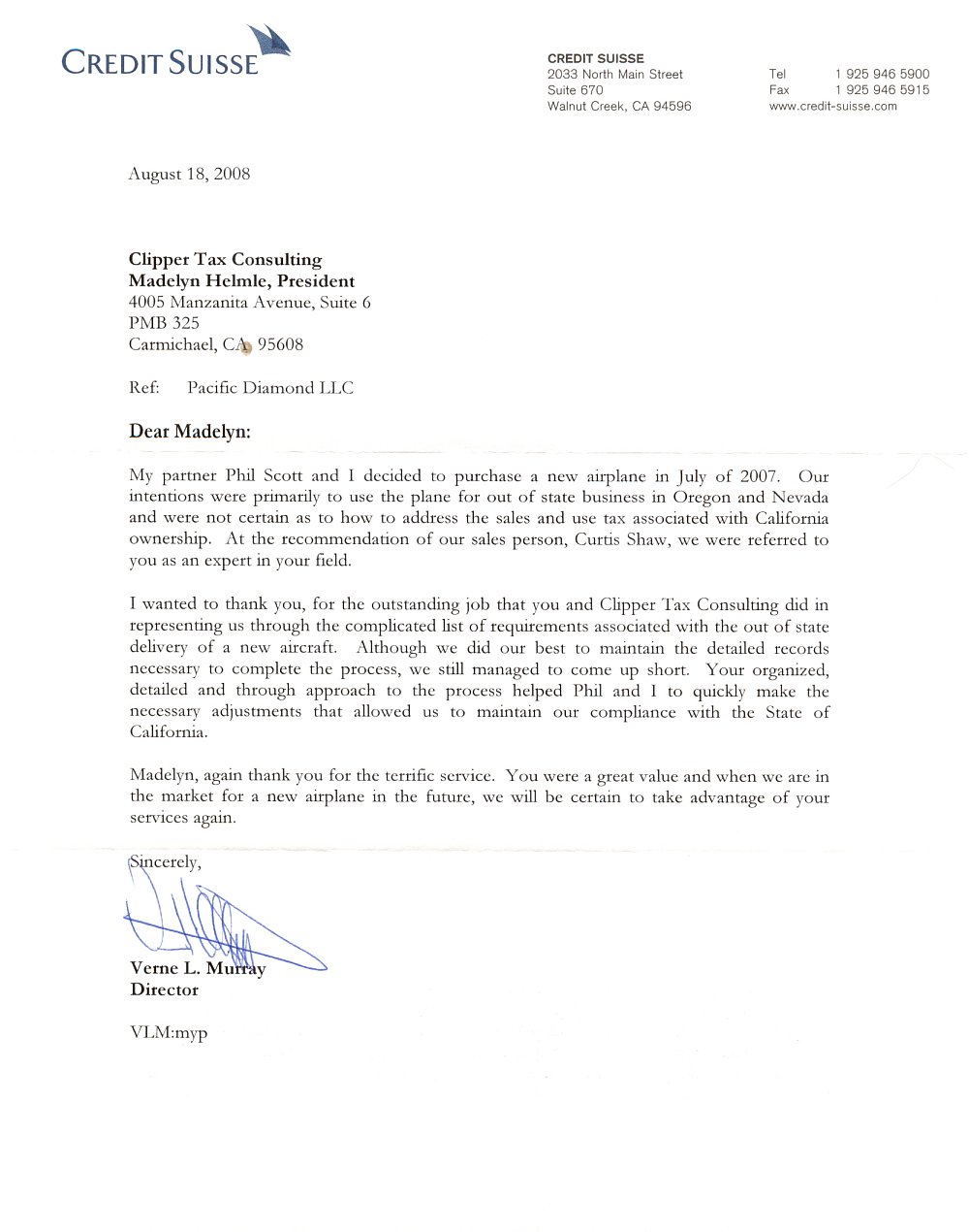 “I wanted to thank you, for the outstanding job that you and Clipper Tax Consulting did in representing us through the complicated list of requirements associated with the out of state delivery of a new aircraft.